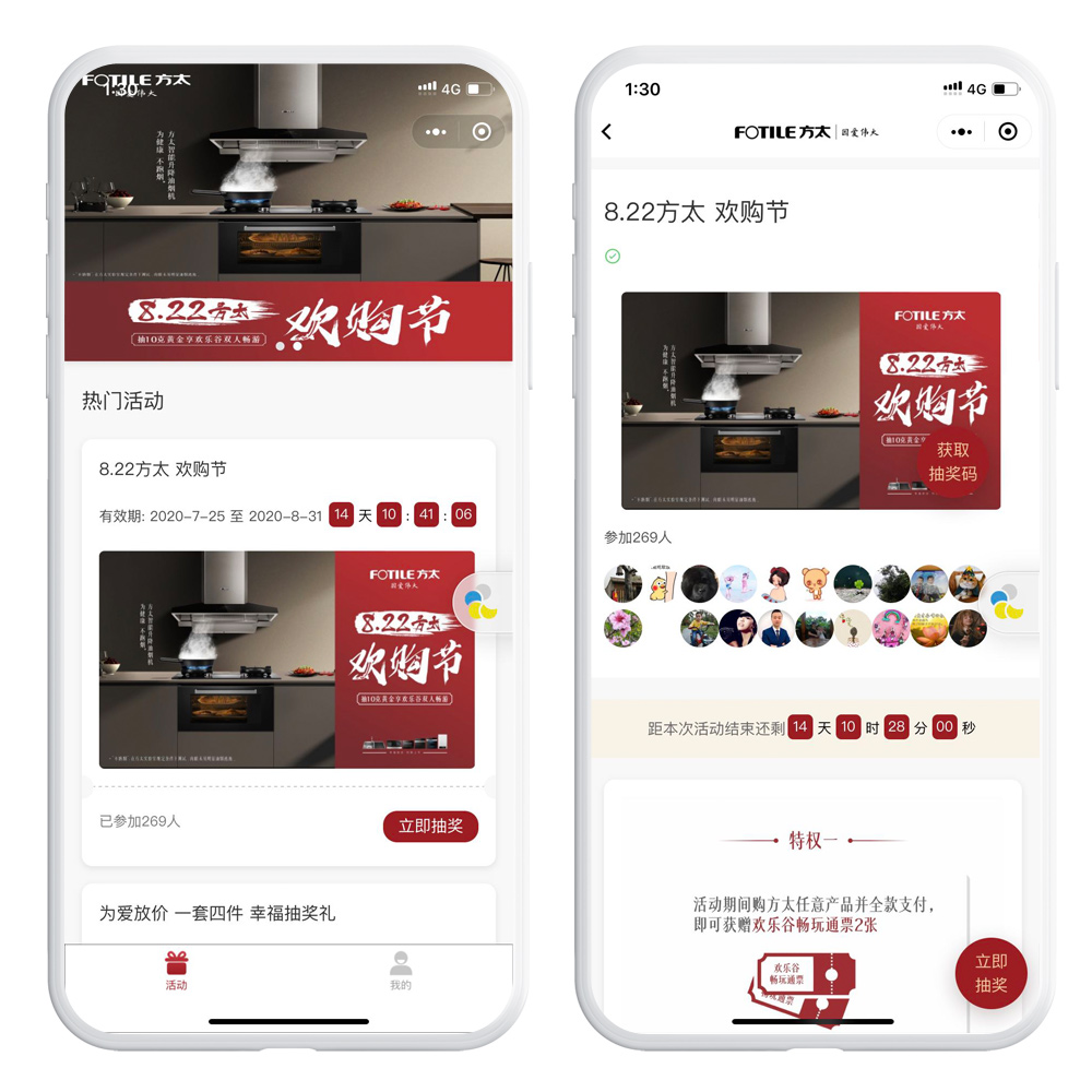 成都龙兵科技帮助其在运营过程中不断优化升级,已经日臻完善,对线上多门店销售的场景做了大量的优化。在方太多个节日活动运营过程中提高了效率,节省了大量的活动成本。