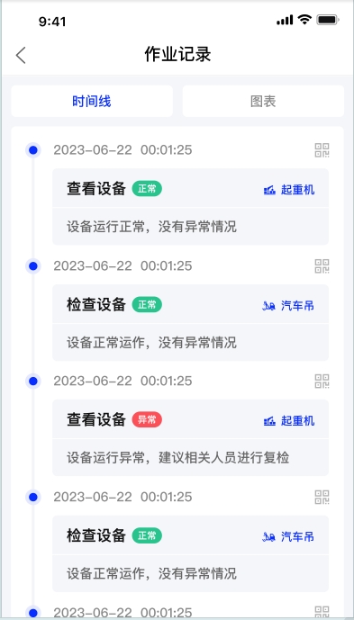 管理人员可以基于时间线的形式查看设备的作业记录。同时支持以图表的形式展现。